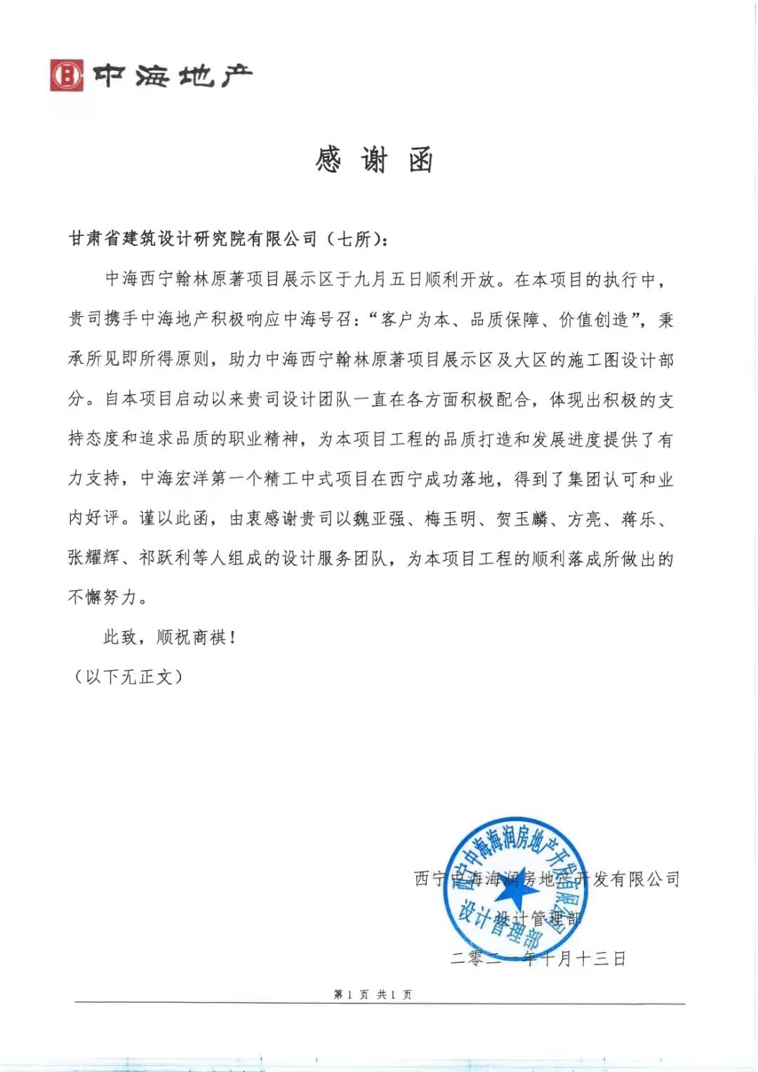 感謝信是認(rèn)可,是鼓勵(lì),也是鞭策,建筑設(shè)計(jì)院全體職工紛紛表示,要向設(shè)計(jì)七所西寧中海翰林原著項(xiàng)目設(shè)計(jì)團(tuán)隊(duì)學(xué)習(xí),立足市場、抓好服務(wù),至臻至善、追求卓越,建功新時(shí)代,奮進(jìn)新征程。