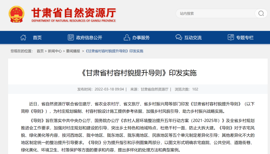 為進一步貫徹落實中共中央辦公廳、國務院辦公廳《農村人居環(huán)境整治提升五年行動方案(2021—2025年)》及全省鄉(xiāng)村規(guī)劃推進會精神,由甘肅省城鄉(xiāng)規(guī)劃設計研究院有限公司牽頭,聯合甘肅省建筑設計研究院有限公司、西北師范大學城市規(guī)劃與旅游景觀設計研究院編制的《甘肅省村容村貌提升導則(試行)》(以下簡稱《導則》),于3月18日由省自然資源廳、省住建廳、省農業(yè)農村廳、省文旅廳、省鄉(xiāng)村振興局等五部門聯合印發(fā)?!秾t》的發(fā)布為全省村莊規(guī)劃編制工作提供了參考依據,是推進鄉(xiāng)村振興戰(zhàn)略實施的重要抓手,是改善我省農村人居環(huán)境、建設美麗甘肅的核心引導,將在規(guī)范我省村容村貌提升、弘揚傳統(tǒng)文化、突出鄉(xiāng)土特色和地域特點,杜絕千村一面,防止大拆大建等方面發(fā)揮重要作用。