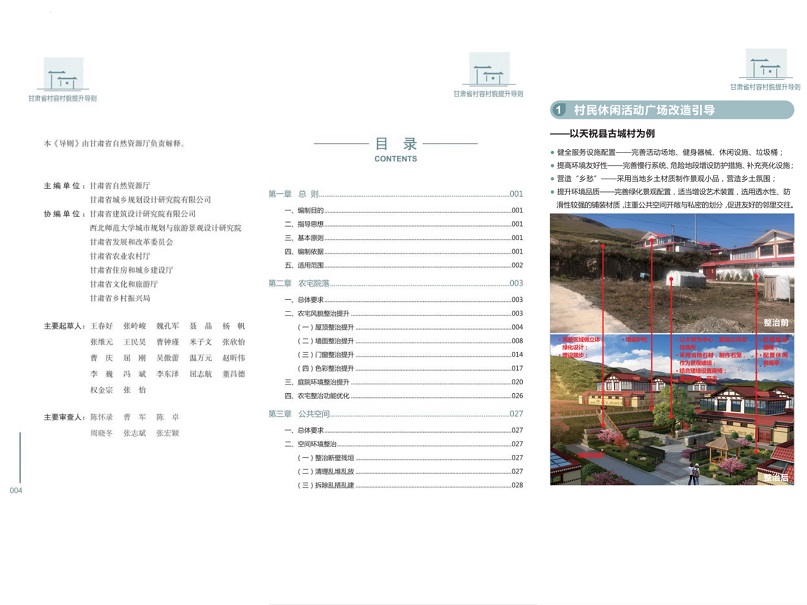 《導則》成果分為提升指引和示例圖集兩部分。提升指引部分以文字形式明確了甘肅省村容村貌整治提升的要求和內容,包括總則、農宅院落、公共空間、道路街巷、綠化美化、環(huán)境衛(wèi)生、村落保護、保障機制和附錄等9個章節(jié),對全省5個國家級歷史文化名村和54個傳統(tǒng)村落實行特殊保護;示例圖集部分以圖文形式提出了村容村貌提升的多種、可選處理方法和典型案例,主要包括農宅院落、公共空間、道路街巷、綠化美化、環(huán)境衛(wèi)生、村落保護等6部分內容。