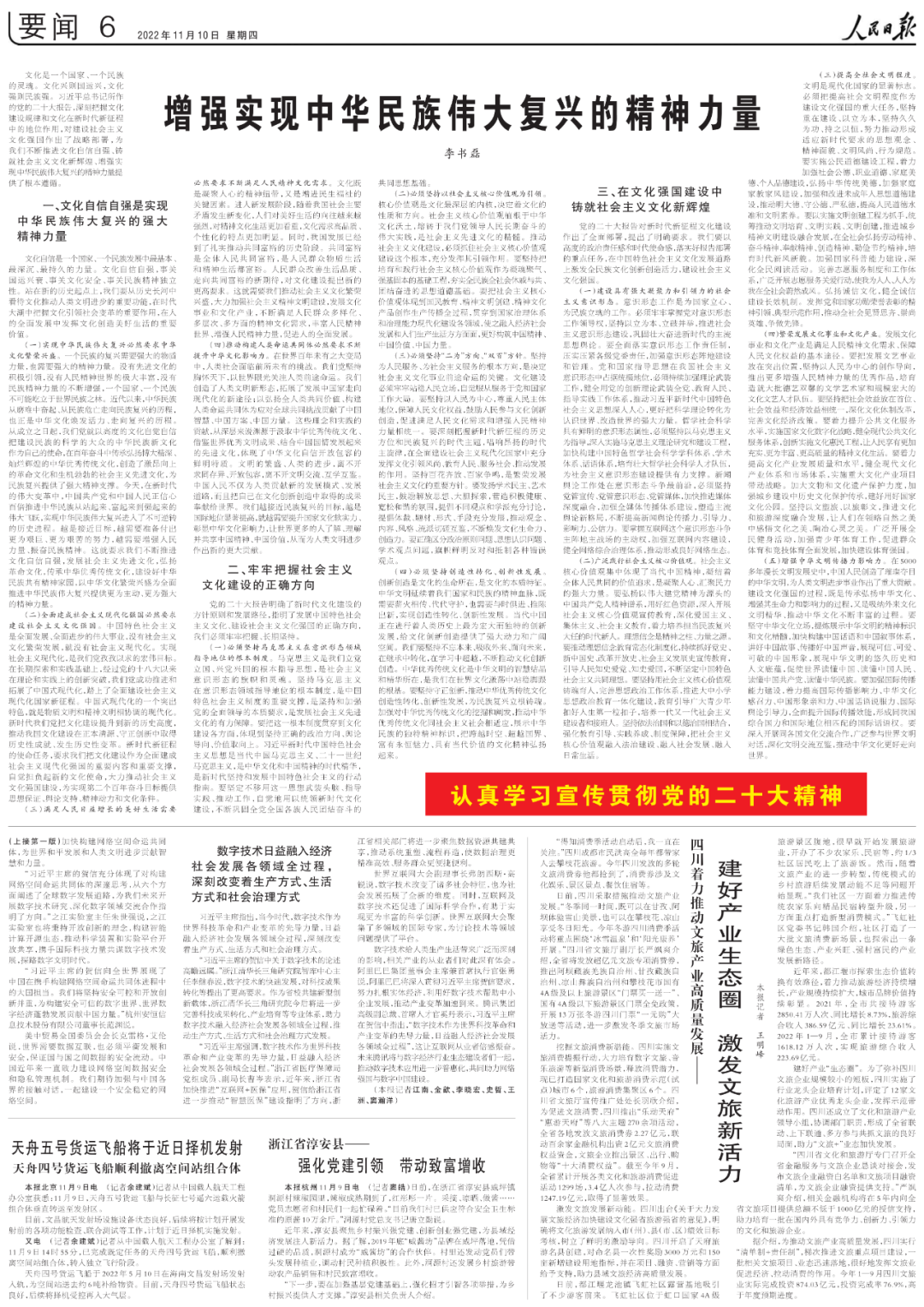 文化是一個(gè)國(guó)家、一個(gè)民族的靈魂。文化興則國(guó)運(yùn)興,文化強(qiáng)則民族強(qiáng)。習(xí)近平總書(shū)記所作的黨的二十大報(bào)告,深刻把握文化建設(shè)規(guī)律和文化在新時(shí)代新征程中的地位作用,對(duì)建設(shè)社會(huì)主義文化強(qiáng)國(guó)作出了戰(zhàn)略部署,為我們不斷推進(jìn)文化自信自強(qiáng)、鑄就社會(huì)主義文化新輝煌、增強(qiáng)實(shí)現(xiàn)中華民族偉大復(fù)興的精神力量提供了根本遵循。
