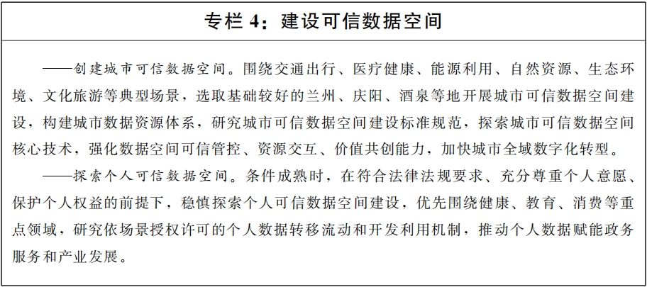 (十一)建設(shè)公共數(shù)據(jù)流通利用基礎(chǔ)設(shè)施。根據(jù)國(guó)家政策文件規(guī)定,探索城市、個(gè)人等可信數(shù)據(jù)空間建設(shè),鼓勵(lì)建設(shè)數(shù)聯(lián)網(wǎng)、數(shù)據(jù)元件等數(shù)據(jù)流通基礎(chǔ)設(shè)施,促進(jìn)數(shù)據(jù)高效便利可信流通。圍繞工業(yè)制造、現(xiàn)代農(nóng)業(yè)、醫(yī)療健康、綠色低碳等重點(diǎn)行業(yè)領(lǐng)域,探索數(shù)據(jù)基礎(chǔ)設(shè)施技術(shù)路線(xiàn)試驗(yàn),為國(guó)家數(shù)據(jù)基礎(chǔ)設(shè)施建設(shè)貢獻(xiàn)“甘肅方案”。推動(dòng)省內(nèi)數(shù)據(jù)基礎(chǔ)設(shè)施規(guī)則、管理、標(biāo)準(zhǔn)相通相容,促進(jìn)跨區(qū)域跨層級(jí)設(shè)施互聯(lián)、能力互通,實(shí)現(xiàn)數(shù)據(jù)利用方式向共享匯聚和應(yīng)用服務(wù)能力并重的方向轉(zhuǎn)變。