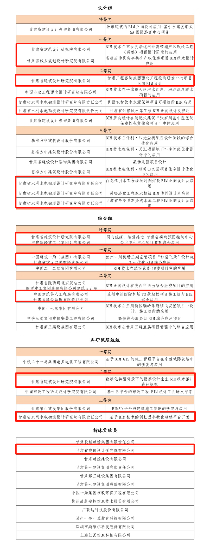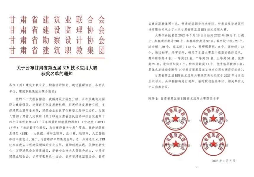 日前,甘肅省第五屆BIM技術(shù)應(yīng)用大賽結(jié)果公布,甘肅工程咨詢集團共獲得14個獎項,其中,“BIM技術(shù)在東鄉(xiāng)縣沿洮河經(jīng)濟帶棚戶區(qū)改造二期(調(diào)整)項目設(shè)計階段的應(yīng)用”等8個項目分別獲設(shè)計組一、二、三等獎,“同心抗疫,智慧建造—甘肅省疾病預(yù)防控制中心公共衛(wèi)生中心項目BIM綜合應(yīng)用”等3個項目分別獲綜合組特等獎及一、二等獎,“數(shù)字化轉(zhuǎn)型背景下的勘察設(shè)計企業(yè)BIM技術(shù)推廣路徑探究”等2個項目分別獲科研課題組二、三等獎,建筑設(shè)計院獲特殊貢獻獎。