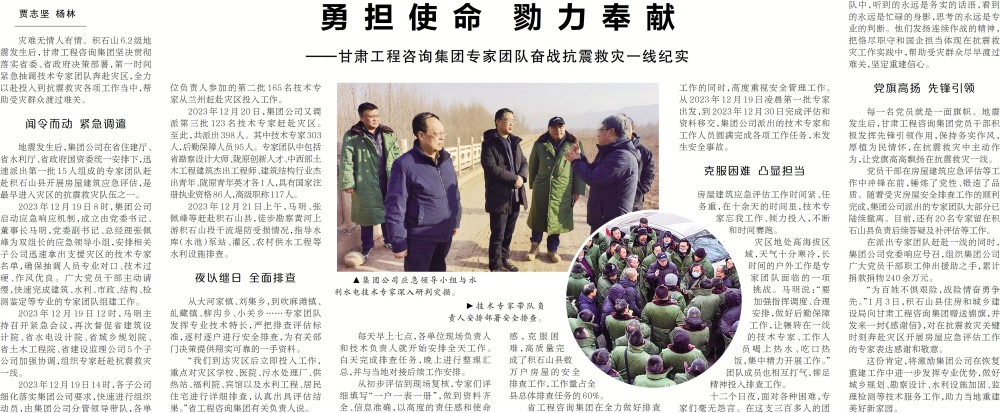 1月15日,《甘肅日報》第4版刊載《勇?lián)姑?勠力奉獻——甘肅工程咨詢集團專家團隊奮戰(zhàn)抗震救災(zāi)一線紀實》。該報道全面反映了集團公司黨委心系災(zāi)區(qū)、聞令而動的一系列擔(dān)當作為務(wù)實舉措,深度展現(xiàn)了專家團隊和干部職工向險而行、甘于奉獻的抗震救災(zāi)生動實踐,進一步凝聚起奮力奪取抗震救災(zāi)全面勝利的強大力量。