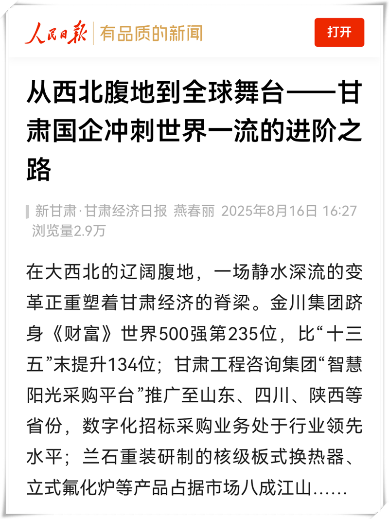 從世界500強的跨越到全國市場的深耕,從技術(shù)平臺的輸出到核心產(chǎn)品的壟斷,這些看似分散的閃光點,實則是甘肅國企在不同賽道上奮力奔跑的足跡。這些閃光的坐標,共同勾勒出甘肅國企向世界一流奮力攀登的壯闊圖景。
