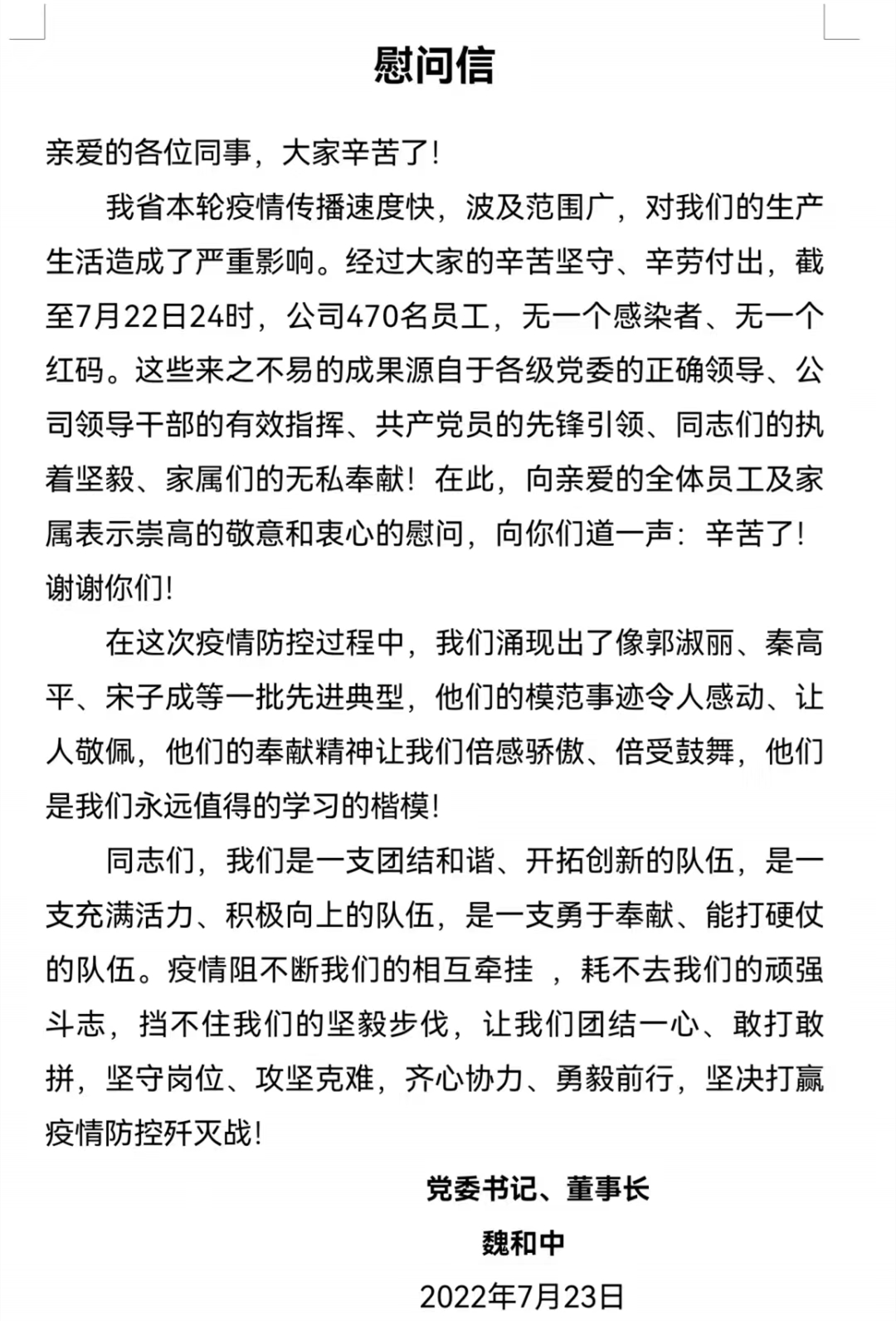 近日,甘肅省建設(shè)監(jiān)理有限責(zé)任公司黨委書記、董事長(zhǎng)魏和中向全體職工發(fā)出慰問信,對(duì)在疫情期間值守項(xiàng)目一線和抗戰(zhàn)疫情一線的黨員干部職工致以最誠(chéng)摯的關(guān)心和感謝。同時(shí),號(hào)召全體干部職工向疫情防控期間涌現(xiàn)出的一線先進(jìn)典型個(gè)人和共產(chǎn)黨員先鋒者學(xué)習(xí),團(tuán)結(jié)一心、敢打敢拼,堅(jiān)守崗位、攻堅(jiān)克難,齊心協(xié)力、勇毅前行,堅(jiān)決打贏疫情防控殲滅戰(zhàn)。