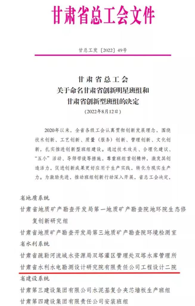 近日,甘肅省總工會(huì)發(fā)布2022年度“甘肅省工人先鋒號(hào)”和“甘肅省創(chuàng)新型班組”名單,甘肅省水電設(shè)計(jì)院的勘探公司榮獲2022年度“甘肅省工人先鋒號(hào)”稱號(hào),工程設(shè)計(jì)二院榮獲“甘肅省創(chuàng)新型班組”榮譽(yù)稱號(hào)。