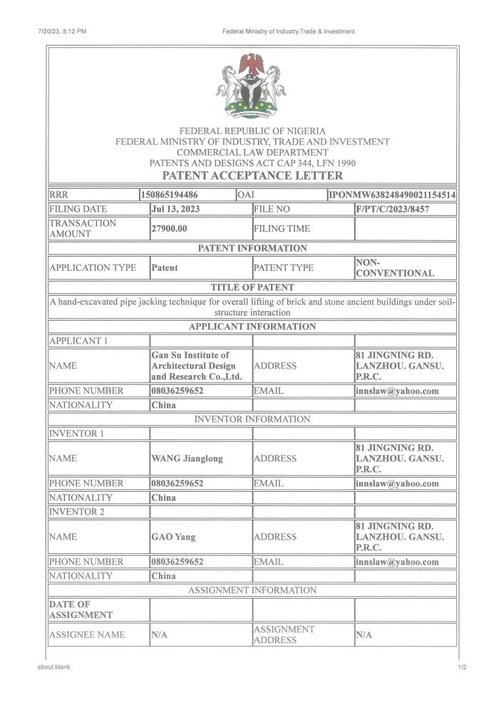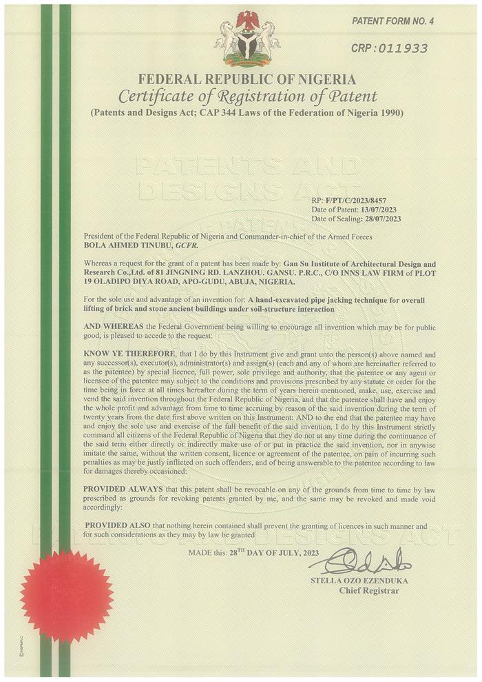 日前,非盟知識產(chǎn)權(quán)局對省建筑設(shè)計(jì)院王江龍等申報(bào)的“土-結(jié)構(gòu)相互作用下磚石結(jié)構(gòu)古建筑整體頂升手掘式頂管技術(shù)”(A hand-excavated pipe jacking technique for overall lifting of brick and stone ancient buildings under soil-structure interaction)進(jìn)行授權(quán),為省建筑設(shè)計(jì)院后續(xù)承接援外項(xiàng)目及國外項(xiàng)目給予了堅(jiān)實(shí)的技術(shù)支撐。