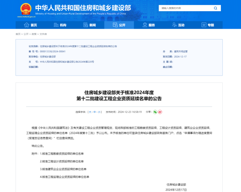近日,住房城鄉(xiāng)建設(shè)部正式發(fā)布了《關(guān)于核準(zhǔn)2024年度第十二批建設(shè)工程企業(yè)資質(zhì)延續(xù)名單的公告》。省建筑設(shè)計(jì)院建筑行業(yè)甲級(jí)、風(fēng)景園林工程設(shè)計(jì)專項(xiàng)甲級(jí)、市政行業(yè)(給水工程)專業(yè)甲級(jí)、市政行業(yè)(熱力工程)專業(yè)甲級(jí)資質(zhì)通過(guò)核準(zhǔn)延續(xù)。